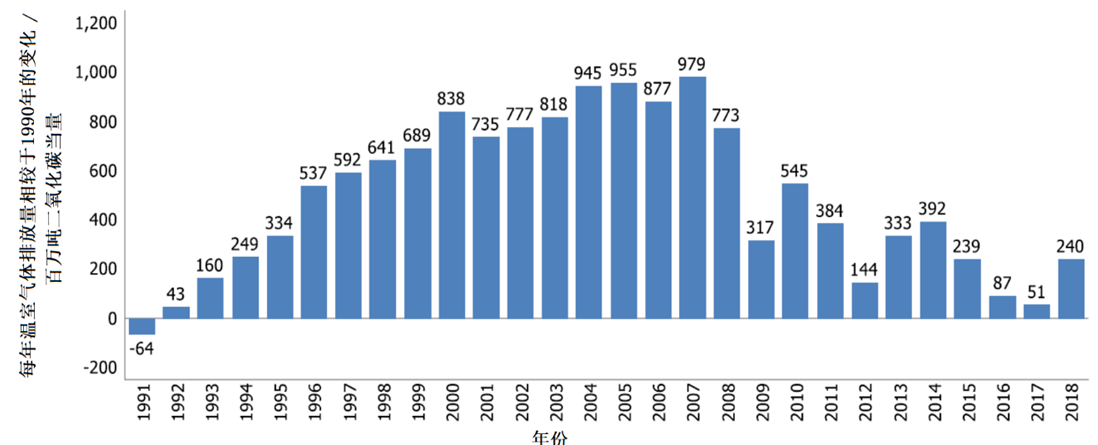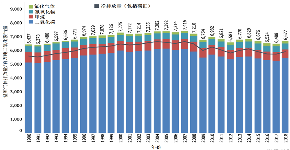图3 1990—2018年美国温室气体气体排放总量的趋势(百万吨二氧化碳当量)